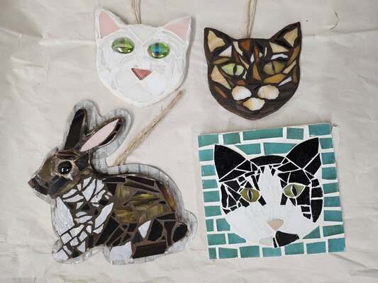 In this exciting 3 hour workshop you can commemorate the most important member of your family, your pet! I have special bunny ornaments to mosaic on as well as a few dog ornaments to choose from. The rest will be made on a small piece of wood so any animal is fair game! Students will go home with grouting supplies and instructions and the option of a virtual tutorial. Please contact me with a photo and/or colors you need for your pet! All tools, instructions and supplies included. Come enjoy a drink purchased at the cafe and create a lasting memory of your fur baby with me!