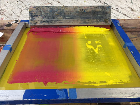 This workshop will cover ink mixing for transparency, split fountains, blending across hues, CMYK color theory, and how factors such as mesh count and layer order affect opacity and hue. The low-tech format with pre-set palettes allows printers of any experience level to join in. With the addition of stencils, each participant will be able to create a series of screenprinted monoprints reflecting their own style and interests.